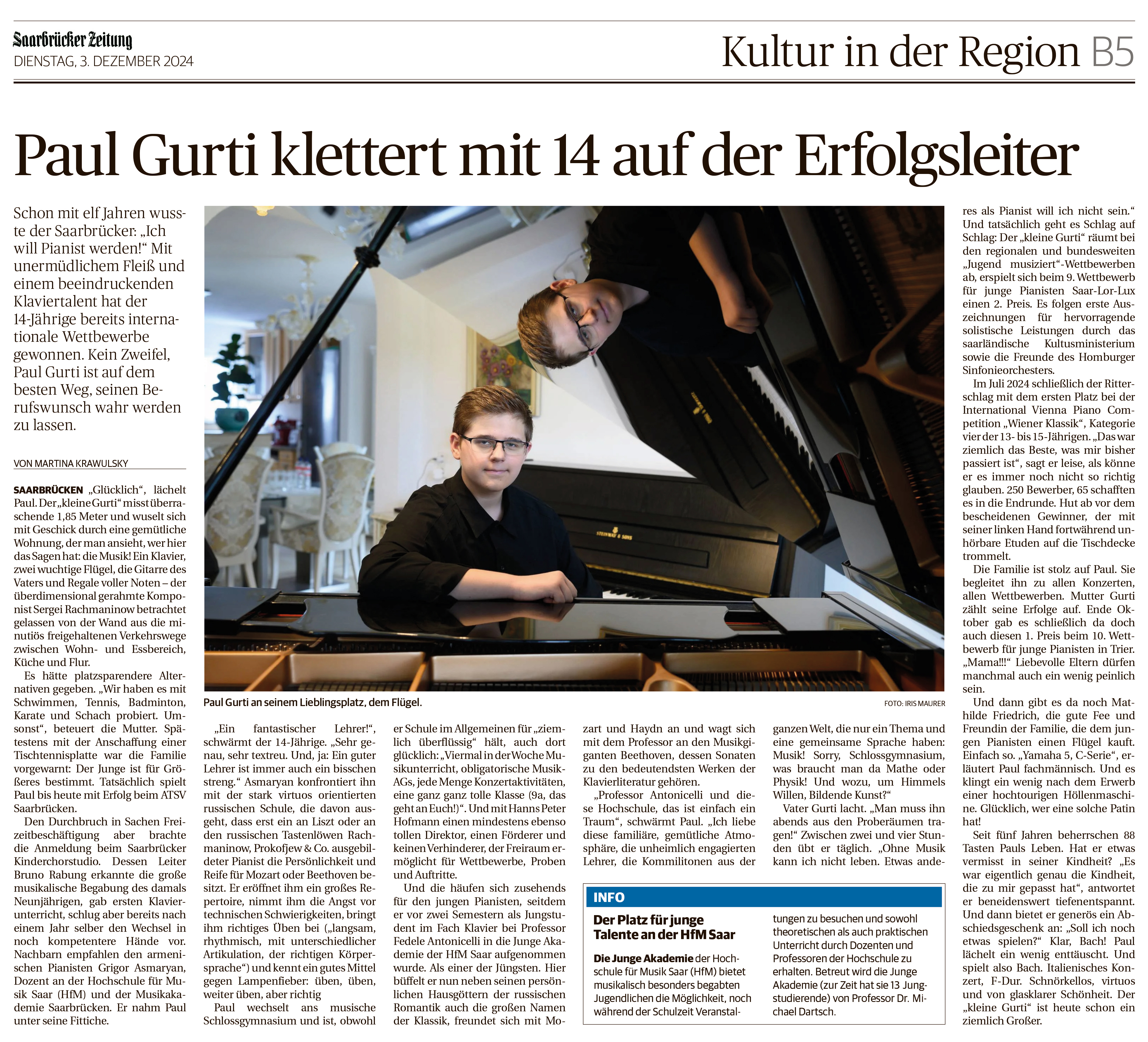 "Paul Gurti gehört zu den großen Nachwuchstalenten am Klavier. Das hat auch die Hochschule für Musik in Saarbrücken erkannt und den erst 13-Jährigen als Jungstudenten angenommen… In seiner Altersgruppe gehört er zur Spitzenklasse. Sein außergewöhnliches Talent hat er Ende Mai im Bundesfinale des Wettbewerbs „Jugend musiziert“ in Zwickau unter Beweis gestellt… Die Konkurrenz war groß, knapp 140 junge Leute traten in seiner Altersklasse an… Die Jury attestierte ihm eine besondere musikalische Begabung und verlieh einen zweiten Preis. „Ich bin zufrieden, es war ja meine allererste Teilnahme“, sagt Paul. In drei Jahren will er in der nächsten Altersklasse erneut angreifen. Und dann vielleicht einen ersten Preis mit nach Saarbrücken bringen. Und die nächste musikalische Herausforderung hat man auch schon im Blick: Paul möchte das „3. Klavierkonzert“ von Rachmaninow einstudieren. „Ein Mix aus Gefühl, Klang, Farbe, Technik“, erläutert der junge Experte.“