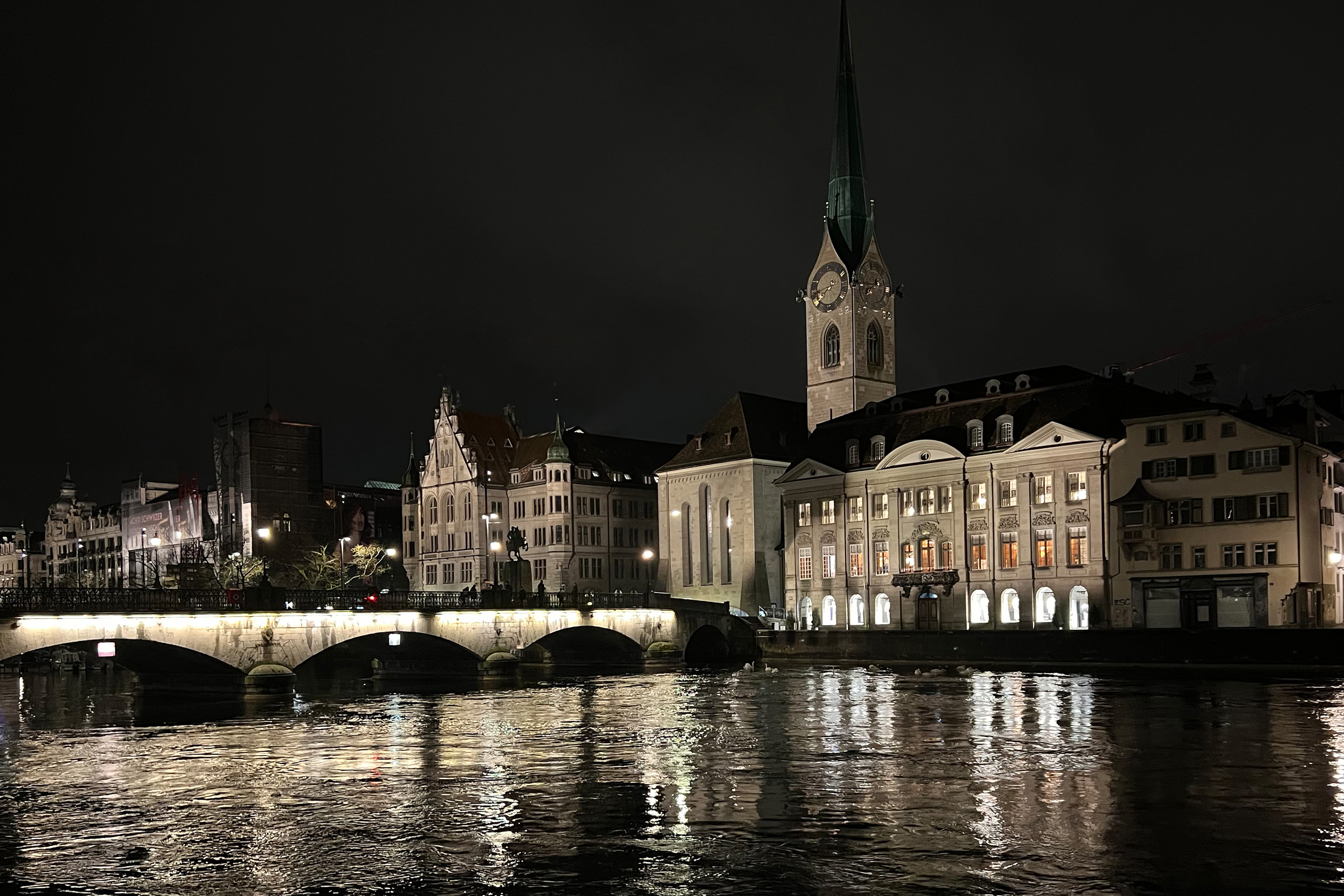 Zürich bei Nacht – Blick auf die Limmat mit dem Grossmünster und der Rathausbrücke. Wir hatten eine wunderbare Zeit in Zürich. |